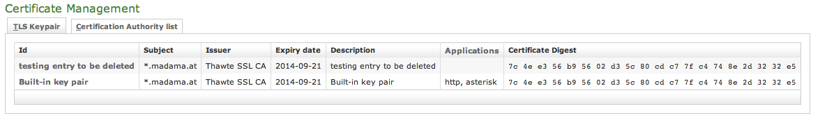 You can get the certificates configuration page using the Certificate Management link in the main menu. As shown above the default page is listing the installed TLS Keypair.