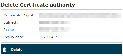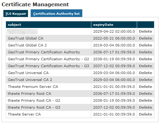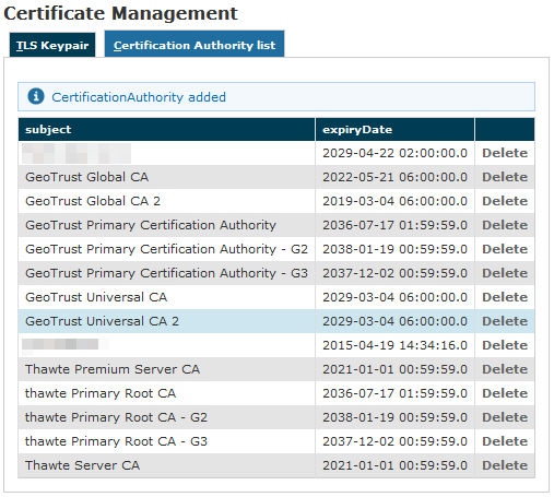 You cannot edit an entry in the CA list, but you still can delete a CA and create a new one for replacement. That said, the way for deleting a CA entry is quite simple. From the CA list shown in figure 14. CA list updated choose the CA you want to expunge and press the Delete link in the last right column.