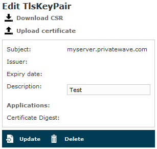 When your done you just press the Upload button on the bottom line: PrivateServer will validate entire Certificate Chain and if it went thought it then you should have a new line in you TLS/Keypair.