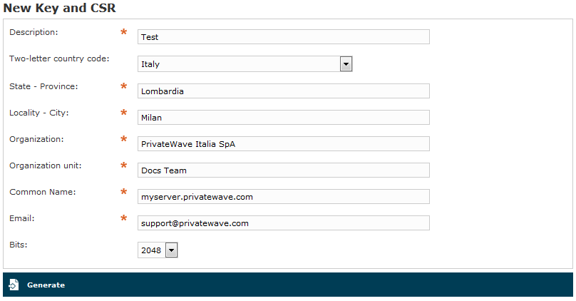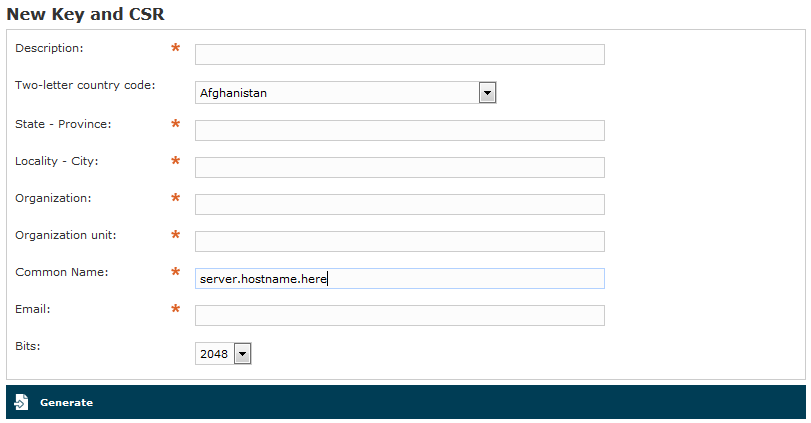 All the fields in above form are standard ones for creating new TLS Key pairs/Certificate Signing Requests.