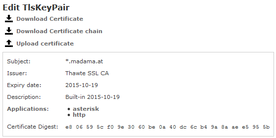 By default, on PrivateServer it's installed one "*.madama.at" wildcard certificate as shown in figure 1. Certificate configuration, default certificate installed