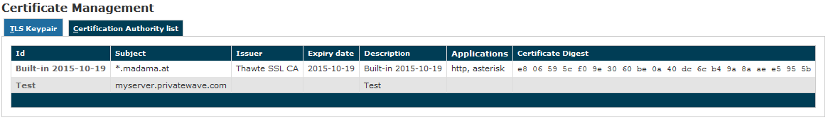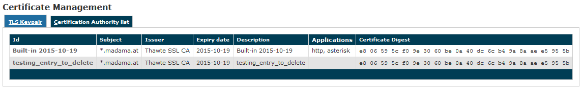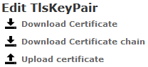 You can get the certificates configuration page using the Certificate Management link in the main menu. As shown above the default page is listing the installed TLS Keypair.