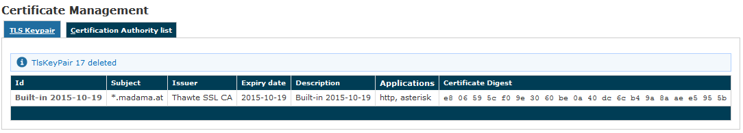 Confirm the deletion in the following pop-up windows. After that you get the new TLS key pair list without the deleted entry and with a warning which explains the entry has been deleted (as in figure 17. the deletion is confirmed).