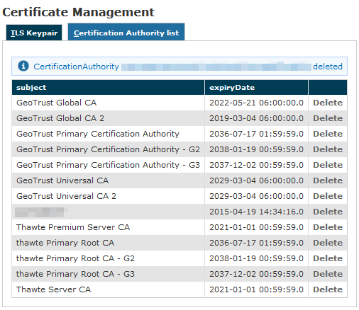 You receive a confirmation about the deletion in the new CA list page (shown above in figure 19. The CA list updated and the warning). Plus the list no more shows the deleted CA entry.