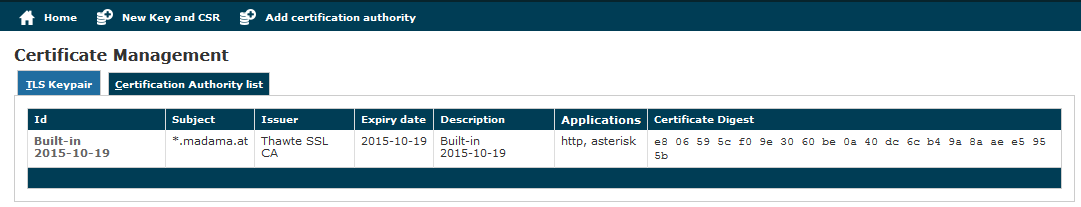 You can get the certificates configuration page using the Certificate Management link in the main menu. As shown above the default page is listing the installed TLS Keypair.