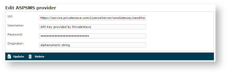 - URI: https://service.privatewave.com/LicenceServer/smsGateway/sendSms