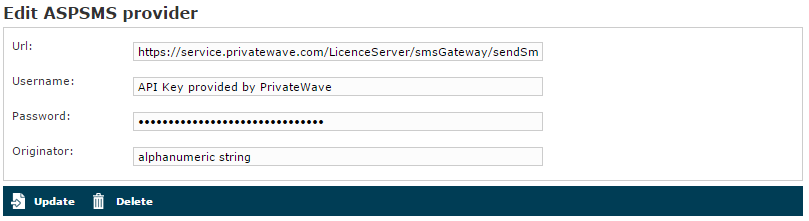 - URI: https://service.privatewave.com/LicenceServer/smsGateway/sendSms
