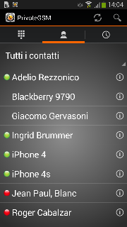 You can make secure calls from PrivateGSM by simply selecting a contact. PrivateGSM sorts the contacts in the same way the address book of the mobile does.