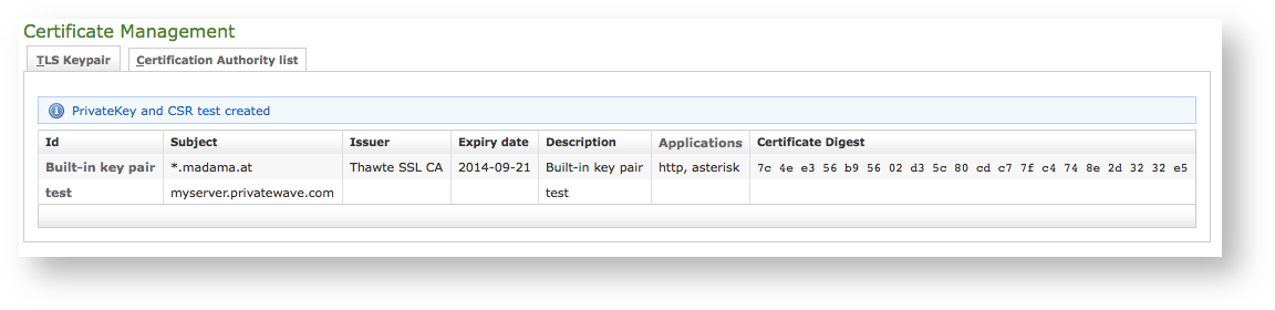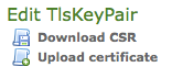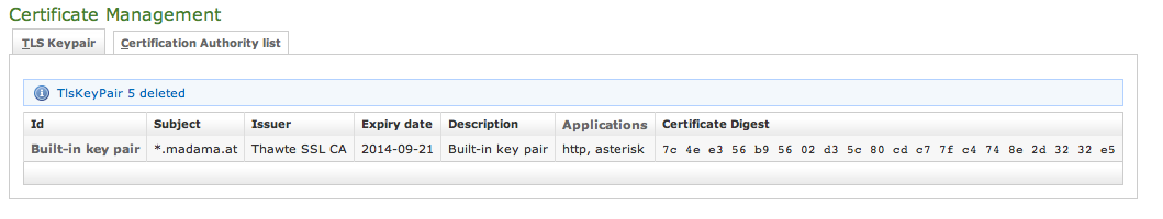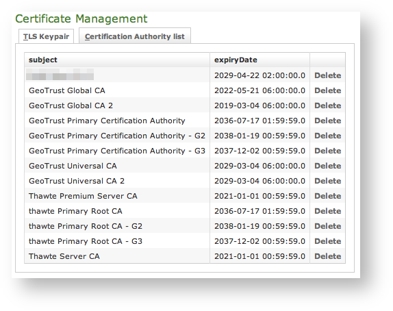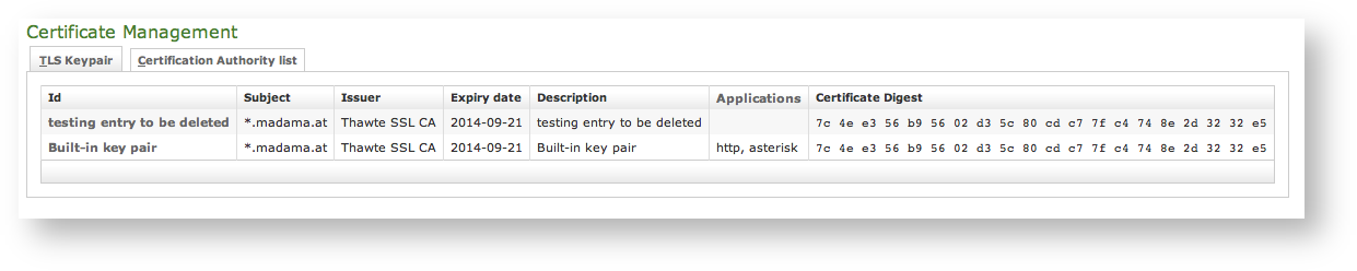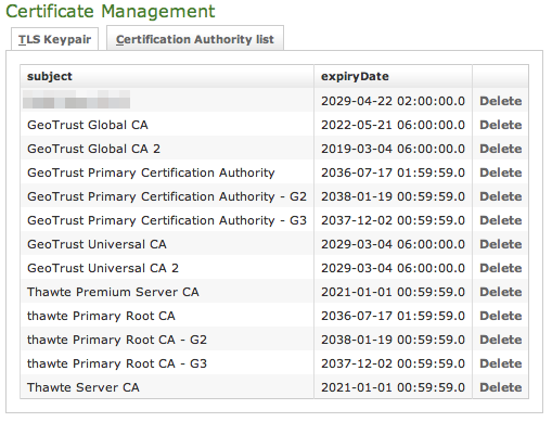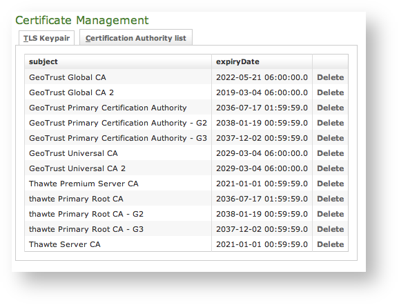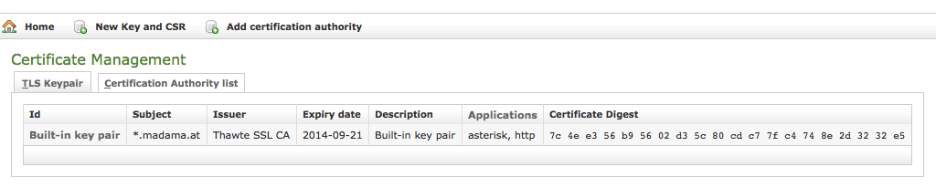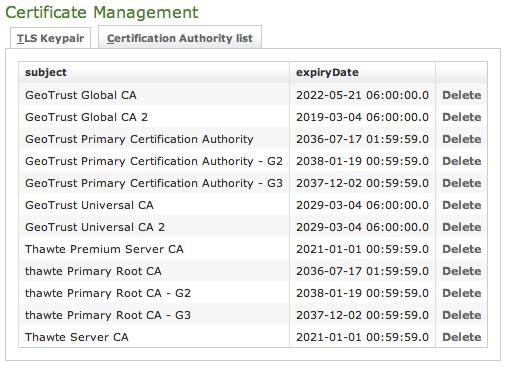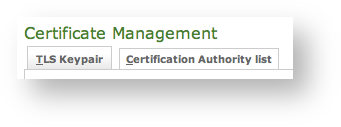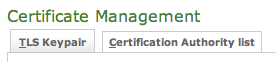 You can get the certificates configuration page using the Certificate Management link in the main menu. As shown above the default page is listing the installed TLS Keypair.