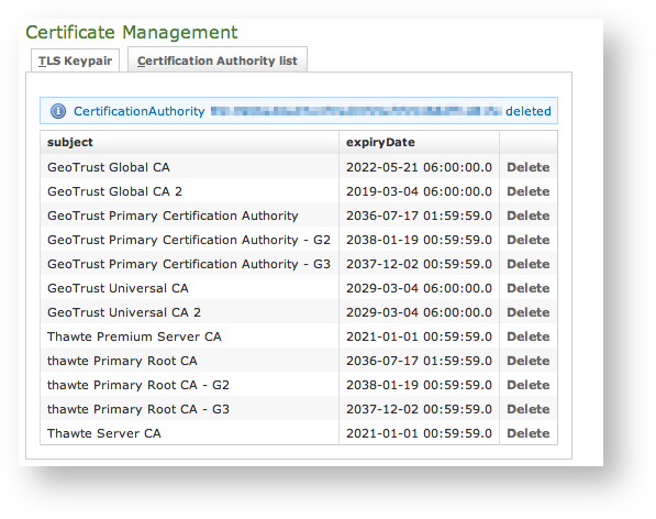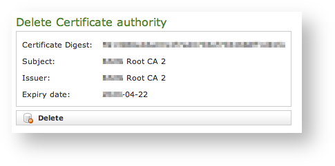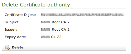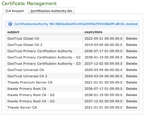You cannot edit an entry in the CA list, but you still can delete a CA and create a new one for replacement. That said, the way for deleting a CA entry is quite simple. From the CA list shown in figure 14. CA list updated choose the CA you want to expunge and press the Delete link in the last right column.