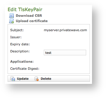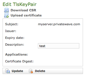 When your done you just press the Upload button on the bottom line: PrivateServer will validate entire Certificate Chain and if it went thought it then you should have a new line in you TLS/Keypair.