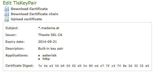 By default, on PrivateServer it's installed one "*.madama.at" wildcard certificate as shown in figure 1. Certificate configuration, default certificate installed