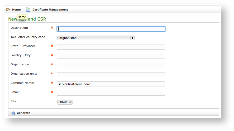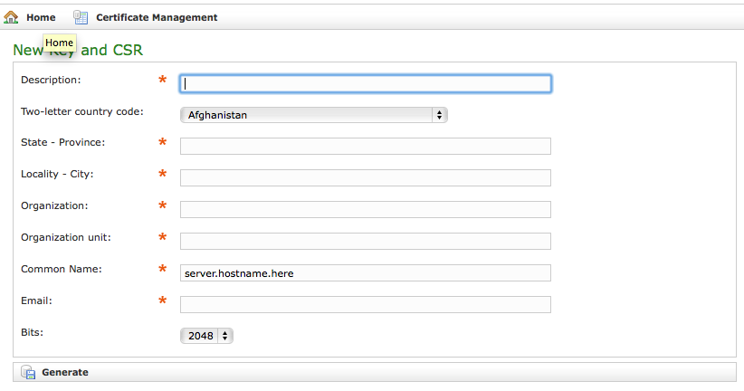 All the fields in above form are standard ones for creating new TLS Key pairs/Certificate Signing Requests.
