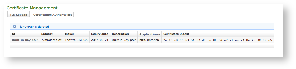 Confirm the deletion in the following pop-up windows. After that you get the new TLS key pair list without the deleted entry and with a warning which explains the entry has been deleted (as in figure 17. the deletion is confirmed).