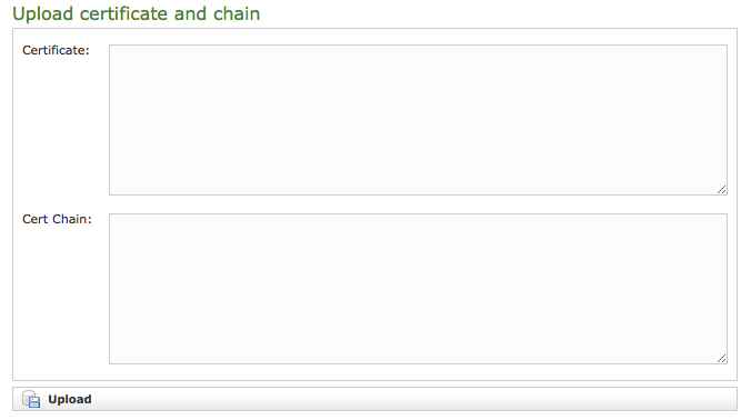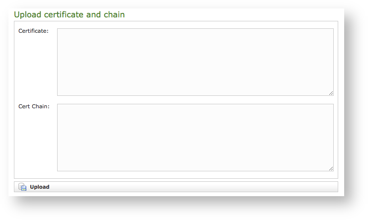 You can fill Certificate text box with actual Certificate as it has been release from Certificate Authority. If you got also some intermediate Certificate, then you have to paste it in Cert Chain.