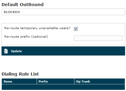 Once you're done you can press the "Update" button to confirm your choice. You return to the "Dialing Rule List" page and this time the "Default Outbound" option is set to the trunk you choose.