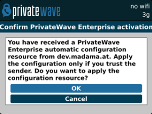 | Click the provisioning link | Select "Open in PrivateWave " | Confirm PrivateWave activation | New configuration has been applied: press OK to start connectivity tests |