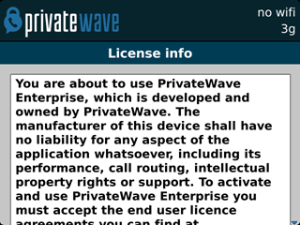 On BlackBerry platform you download the application and accept Application Permission Request.  PrivateWave  will start with the License Info screen. After Activation is performed, you find  PrivateWave  icon in the BlackBerry applications list.