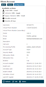 To be able to send text messages with the Automatic Activation you first need to get the Account list (figure 1. The Sip Users Table) or the Account's configuration details (figure 9. account configuration). From both views it's possible to press the Send Activation Sms which would send automatically the URL of the configuration file via Text Message.