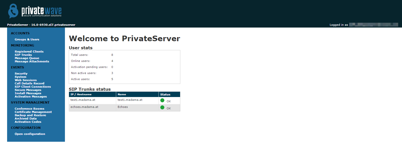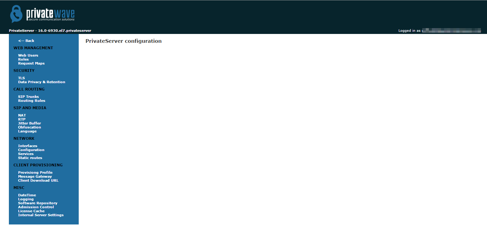 This is enough self-explaining. On the upper left side of the home page you can watch the company logo and just below the PrivateServer version, which in fig. 1 happens to be 16.0-6930.el.