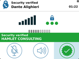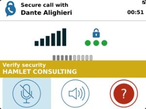PrivateWave Professional uses an encryption and security system based on ZRTP protocol. This protocol is based on human verification of two words (called Short Authentication String or SAS) displayed at the beginning of a call. The SAS are made up of two words in English, randomly generated for each call. The same SAS displayed on the two phones must be verbally compared by the two callers to guarantee call security. After the security was verified the two peers could trust each other.