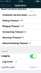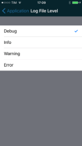 | Press the "More" tab and choose "Settings" | Press the "Edit" button | Select the "Application" entry | Down to the "Debug" section. Select the "Log File Level" | Change the level accordingly to your need |
