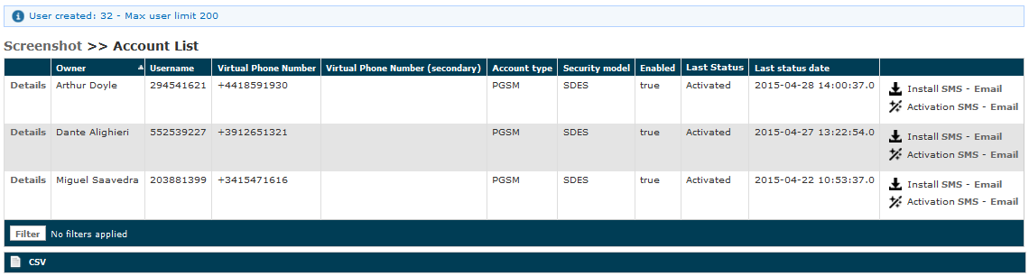 To be able to send text messages with the Automatic Activation you first need to get the Account list (figure 1. The Sip Users Table) or the Account's configuration details (figure 9. account configuration). From both views it's possible to press the Send Activation Sms which would send automatically the URL of the configuration file via Text Message.