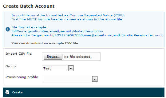Compile all necessary fields of the new account, select a Provisioning Profile and click on "Create". Now jump to 1.1.4 Automatic Activation for activate the user.