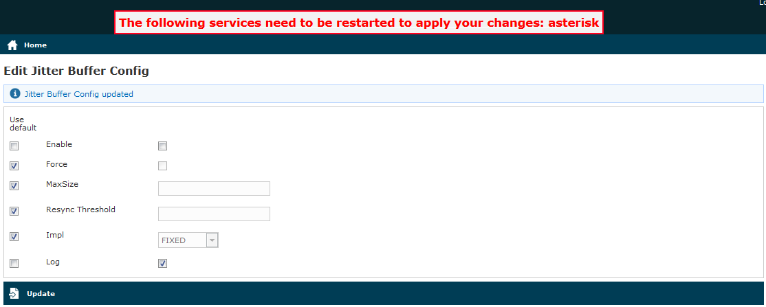 To apply your changes just press the Update button and the management interface will ask you to restart the asterisk service in order to apply your new configuration, as shown in