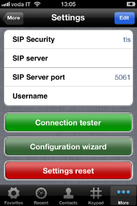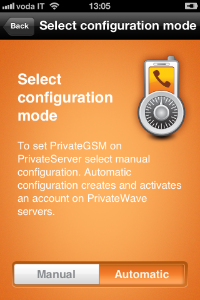 Before you can start using PrivateGSM Professional you have to configure it by choosing Automatic or Manual configuration mode. Choosing Automatic mode PrivateGSM automatically creates an account on PrivateWave servers and bind your mobile phone number to it, so that your contacts can dial you using your mobile number instead of using a new line extension. If you choose Manual mode you will have to provide the SIP server host name and account credentials just like in the case of Enterprise edition.