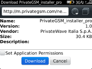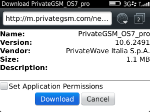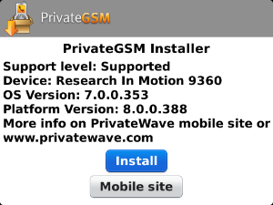 On BlackBerry platform before installing the actual PrivateGSM application you should download and install an "installer" application that checks if you device is supported or if it could be supported after an OS upgrade (eg: Bold 9000 or Curve 8520 has by default an operative system version of 4.6.x which is not supported, but if you upgrade the OS through Desktop Manager to OS 5.x, PrivateGSM will work on these devices).