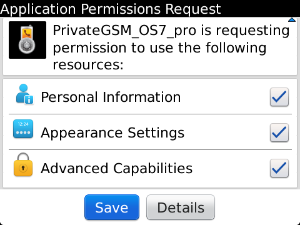PrivateGSM install procedure is very simple: download the application and accept the Application Permission Request. PrivateGSM will start with the License Info screen. You can find the PrivateGSM icon in the BlackBerry applications list.