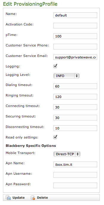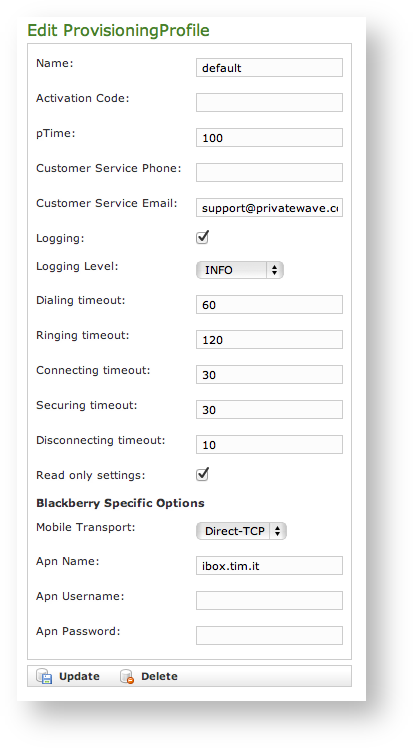 Provisioning profile is a PrivateGSM configuration template, that can be re-used across different VoIP accounts. It is possible to create different provisioning profile, depending on organization and groups of user.