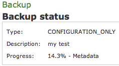 The above figure 1. Backup form shows you the backup form. To archive a backup you must choose from the Type drop-down menu which data to save, if FULL or CONFIGURATION_ONLY. Then you are required to fill the description field. The backup will be shown with its creation date.
