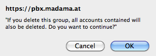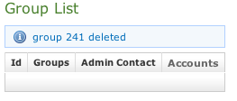 You will come again in the Edit Group form (figure 2. Group creation Form). This time push on the Delete button in the bottom area. A confirmation pop up page asks for confirmation. To continue you just push the Ok button or press Enter on your keyboard. After that you'll get back at the Groups & Accounts page.