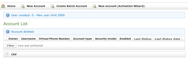 In the Account List page (figure 7. The Sip Users Table) you can see an empty list of accounts. To create a new Sip User you have to click on the New Account (Activation Wizard) button in the top of the page.