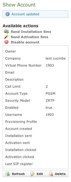 When you have just finished creating the new account (as in figure 9. new SIP account) or picking up the account from the account list ( see figure 12. The Account has been updated) you can send to the customer both a download SMS and a configuration SMS so that he/she would proceed with the installation of the client without any other human help. Click on the "Send installation SMS" to send the link for downloading the application.