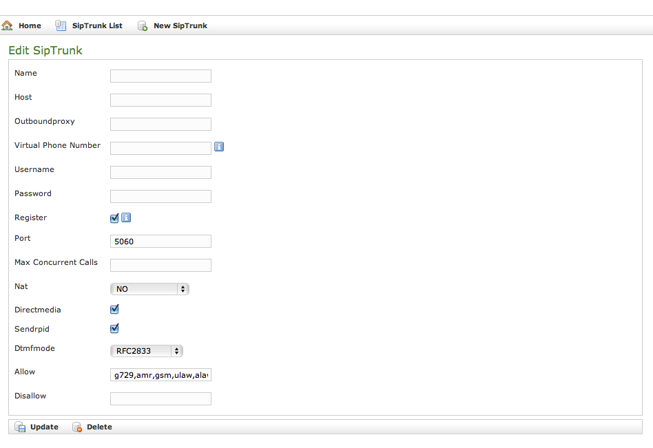 Click on the New Sip Trunk to go to the Edit Sip Trunk page: