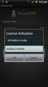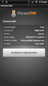 PrivateGSM provides a trial period when you can use all features for free. In order to continue using PrivateGSM you need to activate a valid license. Please contact PrivateWave on how to obtain a license code. Once you have the code you can enter it directly in the application to activate the full functionality of PrivateGSM. After activating the license code check your license state as described in the previous chapter.